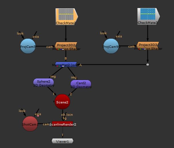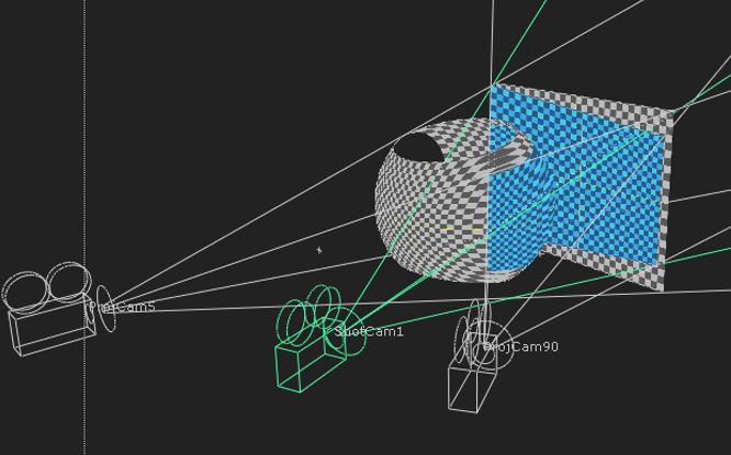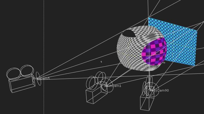 The shot camera has a diagonal translation and slight rotation so as to reveal more of the card from behind the sphere. The grey checkerboard is projected from the starting position of the shot camera
